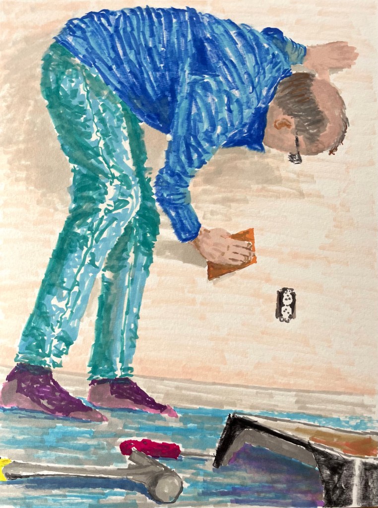 L’heure du bain – Marqueurs sur papier, 16 x 20 pouces, 2022