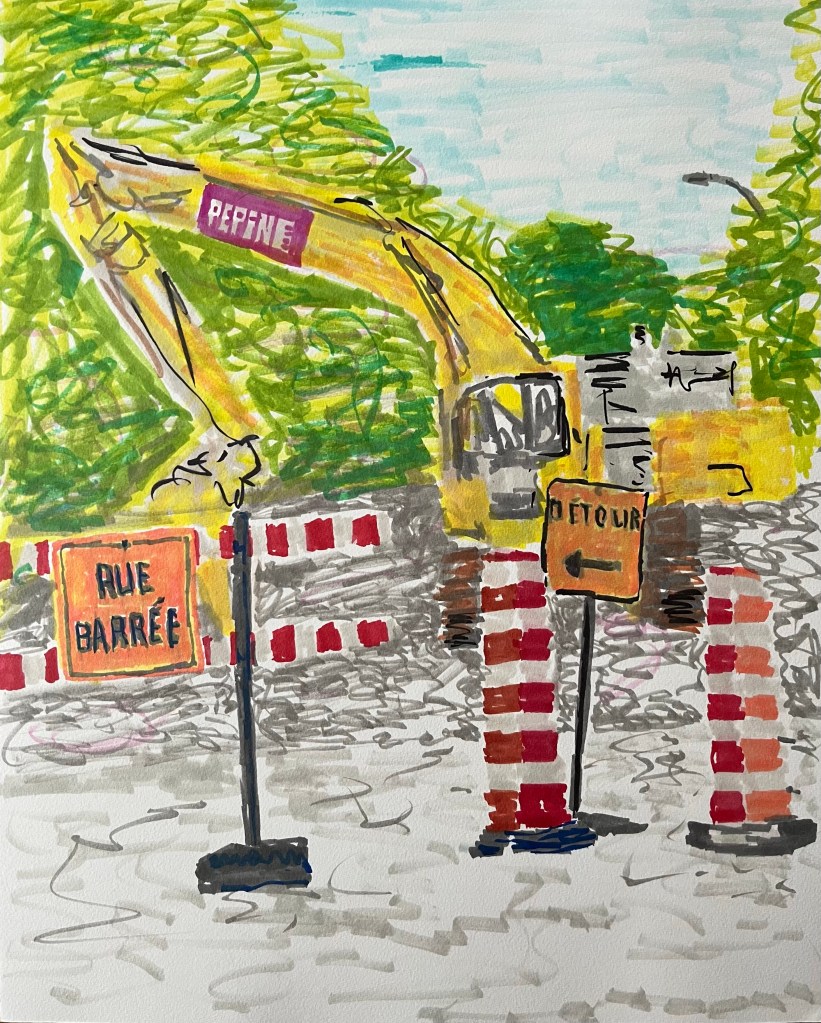 Rue barrée, détour – Marqueurs sur papier, 16 x 20 pouces, 2022