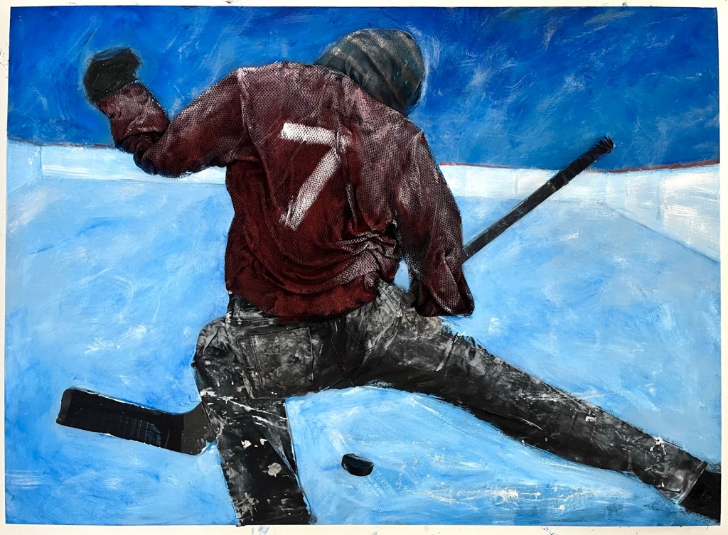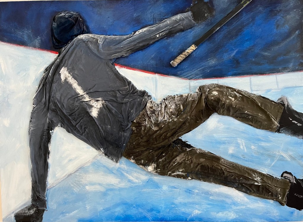 Vous pourrez y voir, pour la première fois, ma série de tableaux sur le thème du hockey. De grands tableaux à l’échelle humaine qui représentent un joueur de hockey en action. Le joueur est composé de véritable vêtements collés sur la surface et accompagné de divers objets tri-dimensionnels. L’effet est saisissant.