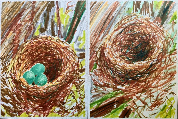 Nid plus, nid moins - Marqueurs sur papier, diptyque 2 fois 12 x 16 pouces, 2023