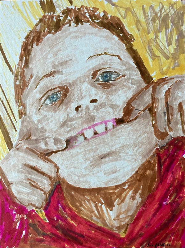 Autoportrait grippé - Marqueurs sur papier, 12 x 16 pouces, 2022